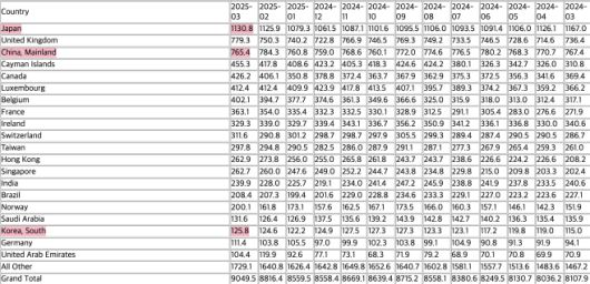 미국 재무부가 16일(현지시간) 발표한 3월 말 기준 미국 국채 보유 국가·지역별 현황./미 재무부 자료 캡처 |