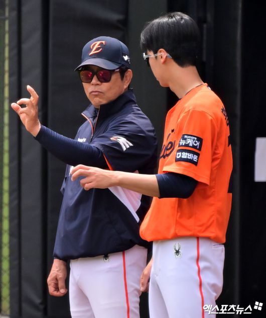 (엑스포츠뉴스 대전, 김한준 기자) 18일 오후 대전 한화생명 볼파크에서 열리는 '2025 신한 SOL Bank KBO리그' SSG 랜더스와 한화 이글스의 경기, 한화 황준서가 양상문 투수코치에게 조언을 받고 있다.김한준 기자 kowel@xportsnews.com