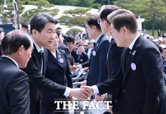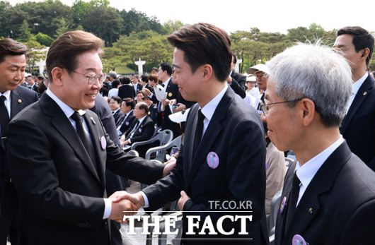 [더팩트ㅣ남윤호 기자] 이재명 더불어민주당 대선 후보(왼쪽)와 이준석 개혁신당 대선 후보(가운데)가 18일 광주 북구 국립5·18민주묘지에서 열린 제45주년 5·18민주화운동 기념식에서 악수하고 있다. 오른쪽은 권영국 민주노동당 대선 후보.