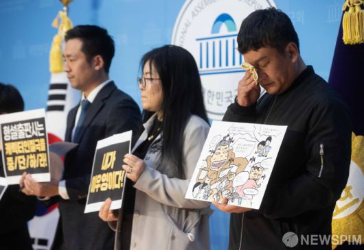 [서울=뉴스핌] 윤창빈 기자 = 만화 검정고무신의 이우영 작가의 동생 이우진 작가가 3월 27일 오후 서울 여의도 국회에서 열린 이우영작가사건대책위원회 기자회견에서 눈물을 훔치고 있다. 2023.03.27 pangbin@newspim.com |