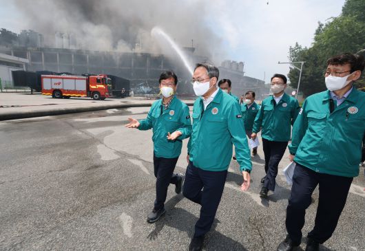 고기동 행정안전부 장관 직무대행(앞줄 가운데)이 18일 광주광역시 광산구 금호타이어 광주 공장 화재 현장을 찾아 화재 진압과 피해 상황 등을 점검하고 있다. 행정안전부 제공 |