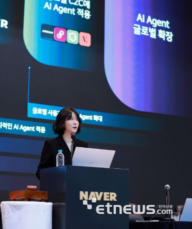 최수연 네이버 대표가 26일 경기 성남시 그린팩토리에서 열린 정기 주주총회에서 '버티컬 인공지능(AI) AI 에이전트'에 대해 설명하고 있다. 〈자료 네이버〉 |