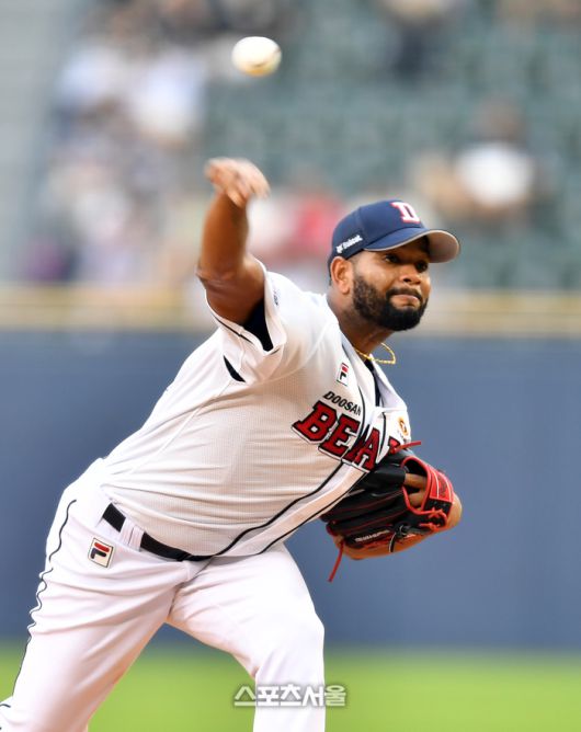 두산 우완투수 알칸타라가 잠실구장에서 열리는 2024 프로야구 두산베어스와 롯데자이언츠 경기에서 선발로 나서 힘껏 공을 던지고 있다. 잠실 | 스포츠서울DB