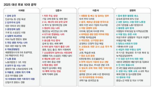 한국 사회의 불평등을 이야기할 때 빠지지 않고 등장하는 소재는 ‘부동산 영향으로 인한 자산 불평등’ ‘대기업·중소기업 간 임금 격차’ ‘정규직·비정규직 간 차별’ 등이다. 이재명 더불어민주당 대선 후보와 김문수 국민의힘 대선 후보가 2025년 6·3 대선을 앞두고 5월12일 중앙선거관리위원회에 제출한 ‘10대 정책 공약’에는 이와 관련한 이슈들이 얼마나 포함됐는지, 유일한 진보 후보인 권영국 민주노동당 대선 후보는 어떤지 살펴봤다.