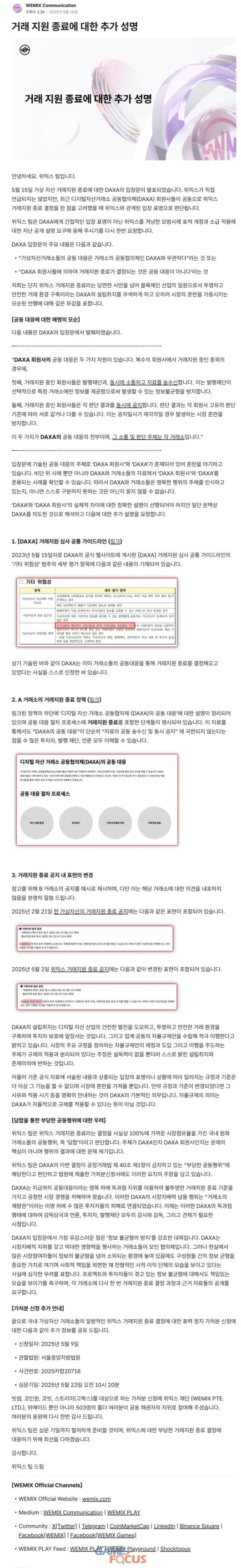 거래지원 종료 공지 내 표현의 변경 위믹스 팀은 2025년 2월 21일 한 가상 자산의 거래지원 종료 공지에서는 거래소가 “DAXA는 투자자 보호 차원에서 공동으로 거래유의종목 지정, 거래지원 종료 등의 조치를 취할 수 있습니다”라고 표현했지만 5월 2일 올라온 위믹스의 거래지원 종료 공지에 대해서는 “DAXA 회원사들은 이용자 보호 차원에서 유의촉구, 거래유의 종목 지정, 거래지원 종료 등의 조치를 취할 수 있다”라고 표현해 주어가 다른 것을 지적했다.