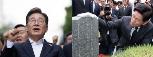이재명 더불어민주당 대선후보가 17일 광주광역시 동구 금남로에서 열린 5·18 광주민주화운동 45주기 전야제에 참석해 임을 위한 행진곡을 제창하고 있다.(왼쪽 사진) 김문수 국민의힘 대선 후보가 17일 광주 북구 국립 5·18 민주묘지를 찾아 무명열사의 묘역에서 참배하고 있다./연합뉴스 |