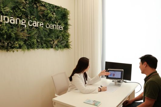 쿠팡 직원이 두뇌건강 상태를 측정하고 쿠팡케어센터 매니저와 정신건강 관리법에 대해 상담하고 있다. 쿠팡 제공 |