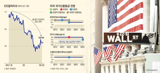 무디스는 전날 “미국이 가진 경제와 금융 측면의 강점을 인정하지만, 이러한 강점만으로는 더는 부채 증가로 인한 재정 지표의 악화를 완전히 상쇄할 수 없다고 판단한다”며 미국의 신용등급을 최고 등급인 ‘Aaa’에서 ‘Aa1’으로 한 단계 낮췄다. 무디스는 그동안 3대 신용평가사 가운데 유일하게 미국에 최고 등급을 부여하고 있었던 곳이다. 신용등급 전망은 ‘부정적’에서 ‘안정적’으로 변경했다.
