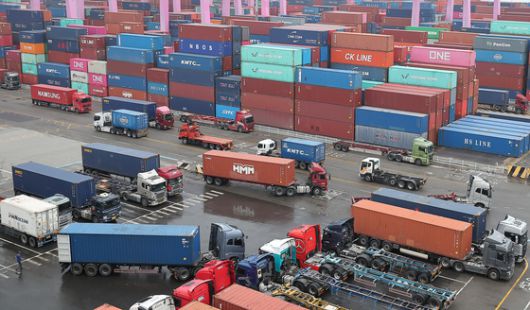 16일 인천시 연수구 인천신항에서 컨테이너 상·하역 작업이 이뤄지고 있다. 정부는 이날 발간한 '최근 경제동향(그린북)' 5월호에서 내수 회복 지연과 미국의 관세 부과로 수출 둔화가 나타나며 우리 경제에 하방 압력이 지속되고 있다고 진단했다. 뉴스1 |