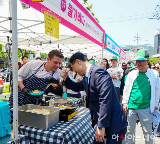 이승로 성북구청장이 18일 서울 성북구 성북로 일대에서 열린 '제17회 성북세계음식축제 누리마실' 불가리아 부스에서 미카엘 셰프와 인사를 나누고 있다. 17회를 맞는 성북세계음식축제 누리마실은 음식을 매개로 전세계 다양한 문화를 선보이는 성북구 대표 축제로 2023년 문화체육관광부의 '지역문화매력 100선(로컬100)'에 선정되기도 했다. 올해는 아시아, 유럽, 아프리카, 아메리카 대륙 19개국의 대사관이 참여해 전통 음식을 선보였다. |