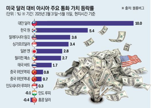 한국 원화 가치 역시 이달 초 미국과 한국이 회담에서 환율정책을 논의했다는 소식에 지난주까지 3주 연속 달러 대비 상승했다. 원·달러 환율은 16일 전일 대비 4.9원 내린 1389.6원으로 주간거래를 마감해 6개월 만의 최저치(원화 가치 최고치)를 기록했다. 쿤 고 호주뉴질랜드은행(ANZ) 아시아 리서치 책임자는 원·달러 환율의 다음 심리적 저항선으로 달러당 1380원을 제시했다. 림 수석 전략가는 “미국과 한국의 양자 관계 개선이 원화를 지지하는 데 도움이 됐지만 관세 완화로 인한 초기 상승세가 사라지면서 원화 절상 속도는 완만해질 것으로 본다”며 “현재 추세 지속 여부는 수출 주도 경제에 도움이 되는 글로벌 무역 회복에 달렸다”고 짚었다.