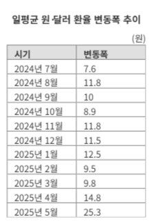 일평균 환율 변동 폭은 도널드 트럼프 미국 대통령이 당선된 지난 11월(11.8원)과 비상계엄에 이어 탄핵 정국이 지속된 12월(11.5원)에 11원대를 기록한 뒤, 올해 1월 12.5원으로 벌어졌다. 이후 2월(9.5원)과 3월(9.8원) 9원대로 안정됐다가 미 관세 부과 여파에 지난 4월 14.9원으로 다시 확대됐다.