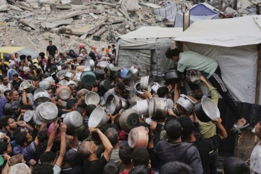 15일(현지 시간) 가자지구 북부 자발리아의 한 급식소에 팔레스타인 주민들이 음식을 배급받기 위해 몰려들고 있다. /AP=뉴시스 |