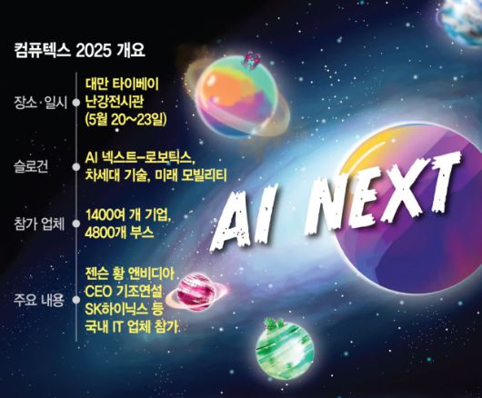 20일 대만 타이베이 난강전시관에서 개막하는 컴퓨텍스 2025의 전시 슬로건은 ‘AI 넥스트’로 주요 테마는 AI와 로보틱스, 차세대 기술, 미래 모빌리티다. 3대 테마를 기반으로 전 세계 34개국에서 참여한 1400여 개 IT 기업들이 4800여 개의 부스를 연다.