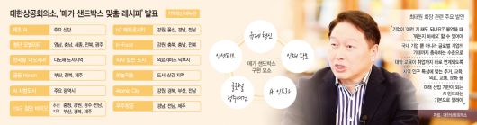 최태원 대한상공회의소 회장 겸 SK그룹 회장이 세상에 내놓은 사회적 아이디어 '메가 샌드박스'를 구체화할 방안이 현실에 나왔다. 특히 지역소멸과 저성장 등을 해결하기 위해 각 지역에서 활성화할 수 있는 산업군을 중심으로 아이디어가 도출됐다.