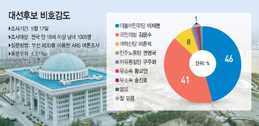 '대통령이 되어선 안 될 후보'로 이재명 후보가 46%, 김문수 국민의힘 후보가 41%, 이준석 개혁신당 후보가 8%로 나타났다.