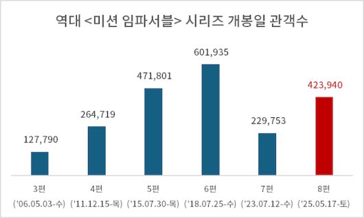 '미션 임파서블: 파이널 레코닝'의 개봉일 관객수가 전체 시리즈 8편 중 3위를 기록했다. 개봉일 관객수 42만명을 기준으로, 최소 400만명 돌파가 가능한 것으로 추산된다.