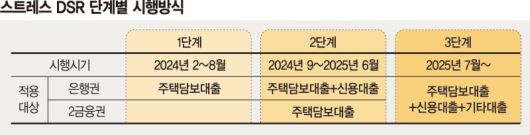 금융당국은 지난해 9월 2단계 스트레스 DSR을 도입하면서 은행권 주담대·신용대출 및 2금융권 주담대에 수도권 1.2%, 비수도권 0.75%의 스트레스 금리를 적용해왔다. 3단계 스트레스 DSR이 도입되면 은행권 및 2금융권의 주택담보대출과 신용대출, 기타대출 금리에 가산금리 100%(하한)인 1.5%가 적용된다.