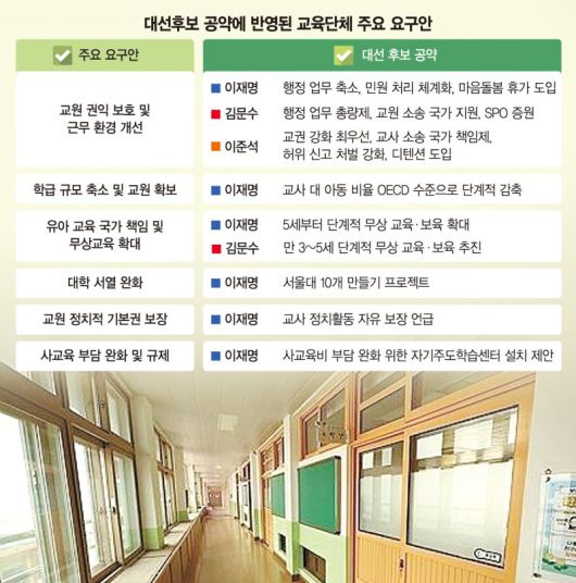 교육계가 제21대 대통령 선거 후보들에게 다양한 교육공약을 요구하고 있다. 핵심은 공교육 정상화다. 학교 본연의 교육 기능을 회복해 모든 학생들이 양질의 교육을 받게 해달라는 것이다. 교사들이 수업과 학생 지도에 집중할 수 있도록 환경 개선도 포함하고 있다.