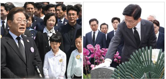 이재명 더불어민주당 대선 후보가 18일 광주 '제45주기 5·18 민주화운동기념식'에 참석한 뒤 취재진의 질의에 답하고 있다(왼쪽). 김문수 국민의힘 대선 후보가 17일 5·18 민주묘지를 찾아 박관현 열사 묘역에서 참배하고 있다. /국회사진취재단·연합 |