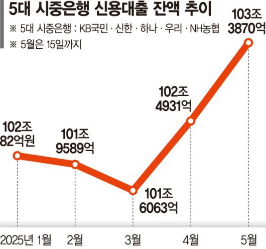 18일 금융권에 따르면 지난 15일 기준 5대 은행(KB국민·신한·하나·우리·NH농협은행)의 신용대출 잔액은 103조3870억원을 기록했다. 지난달 말(102조4931억원)에 비해 8939억원이 늘었다. 이달 초 연휴로 은행 영업일이 8일에 그쳤던 점을 감안하면 이례적인 속도라는 평가다.