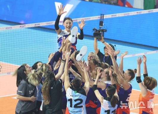 [인천=뉴시스] 이영환 기자 = 18일 오후 인천 부평구 삼산월드체육관에서 열린 KYK 인비테이셔널 2025 여자배구 세계 올스타전 팀 스타와 팀 월드의 경기에서 선수들이 김연경을 헹가래 치고 있다. 2025.05.18. 20hwan@newsis.com |