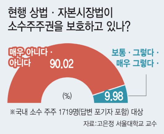 18일 서울대학교 사회발전연구소 고은정 연구교수가 발표한 ‘기업 지배구조 강화를 위한 소수주주권 인식 조사’에 따르면 소수주주 1719명을 대상(답변 포기자 포함)으로 현행 상법·자본시장법이 소수주주권을 보호하고 있는지 물은 결과 ‘매우 아니다’라는 응답이 70.87%(803명)에 달했다. ‘아니다’라는 대답도 19.15%(217명)에 이르렀다.