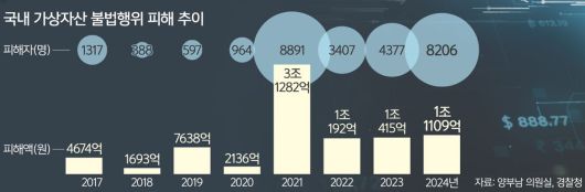 더불어민주당 양부남 의원실이 경찰청으로부터 받은 ‘가상자산 불법행위 피해액 및 피해자 수 추이’에 따르면 2024년 가상자산 불법행위 피해자는 8206명으로 피해액은 1조1109억원으로 집계됐다. 전년도 4377명이었던 피해자는 두 배 가까이 치솟았고, 피해액도 1조415억원에서 6%가량 증가했다.