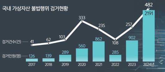 가상자산 범죄로 검거된 인원은 2020년 560명(333건)에서 2021년 862명(235건)으로 증가했다가, 2022년에는 285명(108건)으로 줄었다. 그러나 2023년 다시 증가세로 돌아선 뒤, 지난해에는 검거 인원과 건수 모두 역대 최대치를 기록했다.