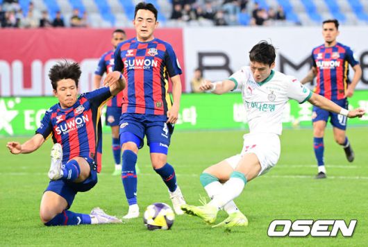 [OSEN=수원, 김성락 기자] 18일 오후 수원시 장안구 수원종합운동장에서 ‘하나은행 K리그1 2025’ 수원 FC와 대전 하나 시티즌의 경기가 열렸다. 수원 FC는 2승 5무 6패로 리그 12위를, 대전은 8승 4무 2패로 리그 1위를 기록하고 있다. 전반 대전 최건주가 슛을 시도하고 있다. 2025.05.18 / ksl0919@osen.co.kr