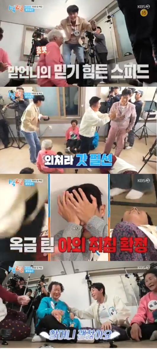 18일 방송된 KBS 2TV '1박 2일 시즌4'에서는 김종민, 문세윤, 조세호, 이준, 딘딘, 유선호가 경북 칠곡에서 할머니들과의 여행을 즐기는 모습이 전파를 탔다.