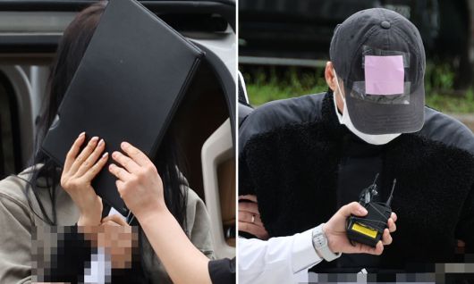 축구 국가대표팀 주장 손흥민의 아이를 임신했다고 주장하며 손씨에게 돈을 뜯어내려 한 20대 여성 양모씨(왼쪽)와 40대 남성 용모씨가 17일 영장실질심사를 받기 위해 서울중앙지법에 들어서고 있다. 연합뉴스 |