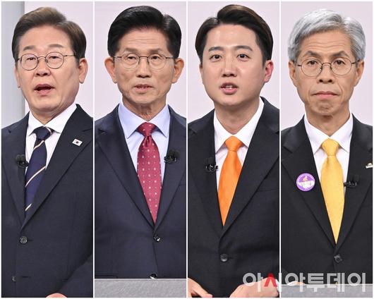 18일 서울 마포구 SBS프리즘타워에서 열린 중앙선거방송토론위원회 주관 제21대 대통령선거 후보자토론회에서 각 정당 대선 후보들이 토론을 벌이고 있다. 왼쪽부터 더불어민주당 이재명·국민의힘 김문수·개혁신당 이준석·민주노동당 권영국 대선 후보. /국회사진취재단