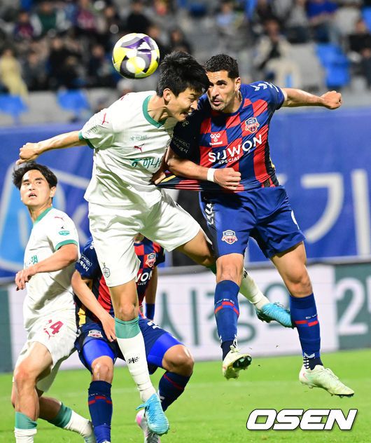 [OSEN=수원, 김성락 기자] 18일 오후 수원시 장안구 수원종합운동장에서 ‘하나은행 K리그1 2025’ 수원 FC와 대전 하나 시티즌의 경기가 열렸다. 수원 FC는 2승 5무 6패로 리그 12위를, 대전은 8승 4무 2패로 리그 1위를 기록하고 있다. 후반 수원 싸박, 대전 임종은이 공중볼 다툼을 벌이고 있다. 2025.05.18 / ksl0919@osen.co.kr