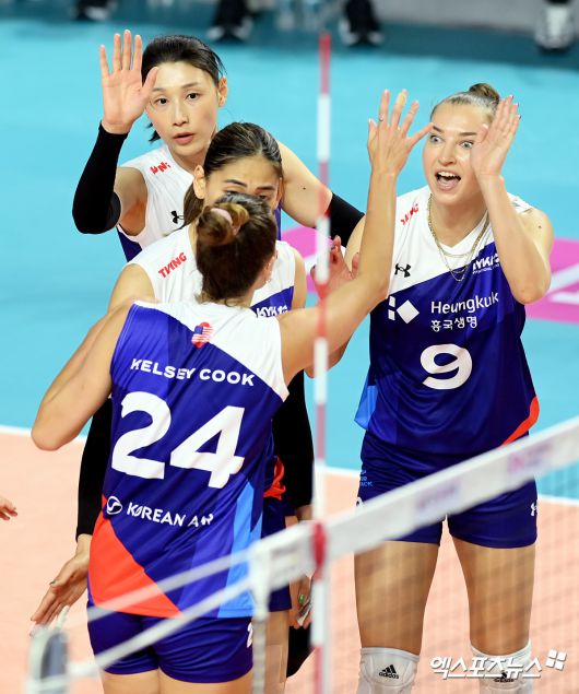(엑스포츠뉴스 인천, 고아라 기자) 18일 오후 인천삼산월드체육관에서 열린 '제2회 김연경 인비테이셔널(KYK INVITATIONAL 2025)' 세계 올스타전, 팀 스타 김연경, 브란키차 미하일로비치, 켈시 로빈슨이 득점한 뒤 기뻐하고 있다.고아라 기자 iknow@xportsnews.com