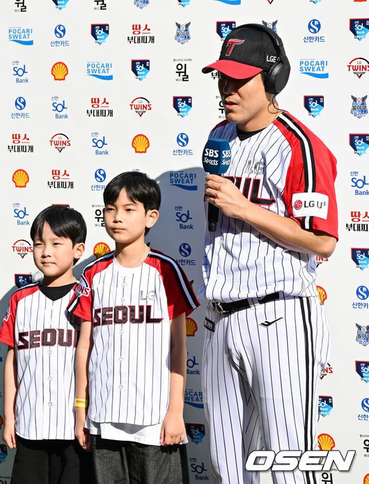 [OSEN=잠실, 민경훈 기자] 18일 오후 서울 잠실야구장에서 2025 신한 SOL Bank KBO리그 LG 트윈스와 KT 위즈의 경기가 열렸다.이 경기에서 LG는 KT에 5-1로 승리했다. LG는 리그에서 가장 먼저 30승(16패) 고지에 올랐다. 10승, 20승, 30승 모두 가장 빨랐다.LG 박동원과 문보경이 나란히 투런 홈런을 터뜨렸고, 김현수는 3타수 2안타 1타점 2득점을 기록했다.LG 선발 치리노스는 6이닝 동안 97구를 던지며 5피안타 무사사구 4탈삼진 1실점으로 호투했다.경기를 마치고 LG 김진성이 이날 시구 시타를 했던 자녀 김민찬-김리호 군과 함께 인터뷰를 하고 있다.. 2025.05.18 /rumi@osen.co.kr |