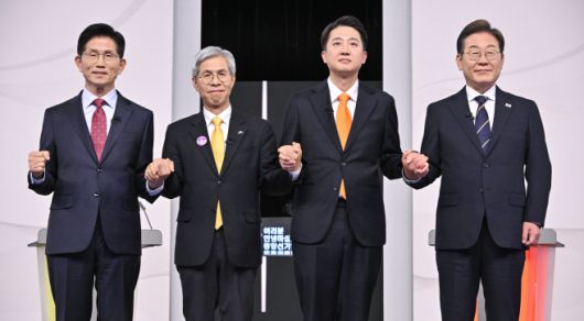 국민의힘 김문수(왼쪽부터)·민주노동당 권영국·개혁신당 이준석·더불어민주당 이재명 대선후보가 18일 서울 마포구 상암동 SBS 프리즘센터 스튜디오에서 열린 제21대 대선 1차 후보자 토론회 시작에 앞서 기념촬영을 하고 있다./국회사진기자단 |