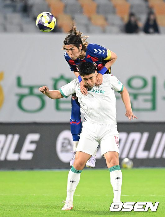 [OSEN=수원, 김성락 기자] 18일 오후 수원시 장안구 수원종합운동장에서 ‘하나은행 K리그1 2025’ 수원 FC와 대전 하나 시티즌의 경기가 열렸다. 수원 FC는 2승 5무 6패로 리그 12위를, 대전은 8승 4무 2패로 리그 1위를 기록하고 있다. 후반 수원 최규백이 공중볼 다툼을 하고 있다. 2025.05.18 / ksl0919@osen.co.kr