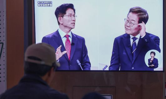 18일 서울역 대합실에서 시민들이 제21대 대선 1차 후보자 토론회 중계방송을 지켜보고 있다. 연합뉴스 |