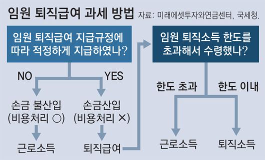 그렇다면 해당 규정에 임원 퇴직금 한도를 넉넉히 정해 두면 되지 않을까. △특정 임원에 대한 과도한 한도 책정 △임원별로 상이한 지급액 △특정 임원 퇴직 직전 규정 변경 등의 경우 회사가 임원 퇴직금을 비용으로 처리하지 못할 수 있다. 회사가 비용 처리를 하지 못하면 임원도 세 부담이 늘어나게 된다.