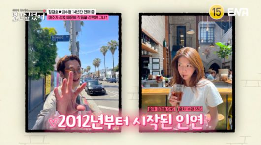 “14년째 연애 중이다”라고 답하는 정경호에 놀란 최화정은 “이거는 기네스북에 날 일 아니냐”라고 감탄했다. 현재 정경호와 수영은 2012년 연애를 시작해 14년째 흔들림 없이 사랑을 이어오고 있다. 이에 최화정은 “오래 사귀면 헤어지고 이러는데”라며 신기해했고, 정경호는 “시간이 참 너무 빠르다. 수영 씨고 드라마 ‘금주를 부탁해’를 시작해서”라며 수영이 출연하는 드라마를 깨알 홍보했다.