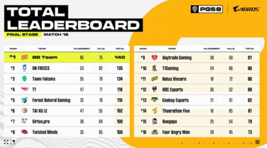두번째 매치에서 프릭스는 4킬을 추가하면서 1위인 팀 팔콘스와 8점 차이로 좁히는데 만족해야 했습니다. 게다가 치킨을 가져간 BB에게 2위 자리마저 내주며 3위로 떨어지고 말았습니다.