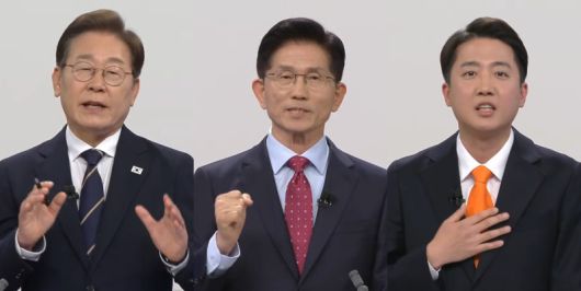 18일 중앙선거방송토론위원회가 주관한 대선 후보자 1차 TV토론회에서 각 당 대선 후보들이 노란봉투법 추진과 반도체특별법을 포함한 민간 경제정책과 통상 전략, 비상계엄 선포에 따른 경제 악영향 책임 등을 놓고 공방을 벌였다. 왼쪽부터 더불어민주당 이재명, 국민의힘 김문수, 개혁신당 이준석 후보. 채널A 화면 캡처 |