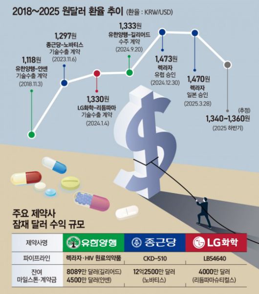 [한국금융신문 김나영 기자] 널뛰는 달러/원 환율에 제약사들의 희비가 엇갈리고 있다. 유한양행·종근당·LG화학 등 글로벌 기술수출 및 수주 성과로 축포를 터뜨린 곳들이 수익을 달러로 벌어들여서다. 고환율 국면에선 환차익 수혜가 예상되지만, 추후 달러 안정화에 따른 수익 감소 가능성도 제기된다.