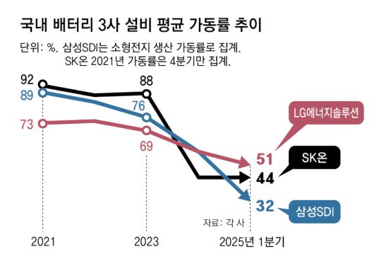 배터리 3사가 빚을 내가며 버티고 있지만 설비 가동률은 역대 최저 수준으로 곤두박질쳤다. LG에너지솔루션의 올해 1분기 설비 가동률은 51%로 지난해 대비 7%포인트 떨어졌다. 삼성SDI도 지난해 58%에서 올해 1분기에는 32%로 급락했다. SK온은 지난해와 올해 1분기 모두 가동률이 44%를 유지했다.