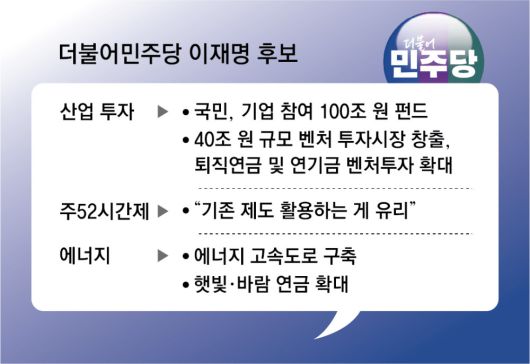 이 후보는 17일 페이스북을 통해 “40조 원 규모의 벤처 투자시장을 창출하겠다. 모태펀드 예산을 확대하고, 안정적인 운영을 위해 존속기간을 연장하겠다”고 밝혔다. 구체적인 벤처 투자 증대책으로 퇴직연금의 벤처 투자를 허용하고, 연기금 투자 풀의 벤처 투자도 확대한다는 복안을 제시했다. 연기금 투자 풀이란 정부에서 연기금의 여유 자금을 통합해 운영하는 투자체계를 가리킨다.