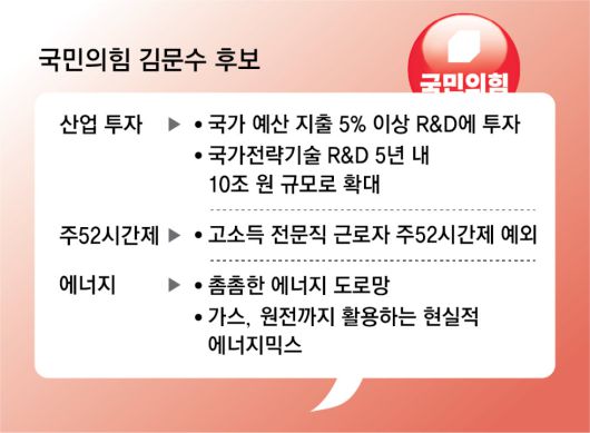 연구개발(R&D) 분야 국가 투자 면에서 김 후보는 △국가 예산 지출의 5% 이상을 R&D에 투자 △국가전략기술에 대한 R&D 예산을 5년 내에 10조 원 규모로 확대 △R&D 사업 예비타당성 조사 폐지 등을 공약했다. 이준호 서울대 기초과학연구원장은 “실제 예산 규모가 그렇게 나올 수 있는지, 기획재정부와 협의를 거쳐 발표된 것인지 궁금하다”며 “예산을 늘리겠다는 ‘수월성’만 붙들고 갈 것이 아니고 다양한 싹을 키워내겠다는 ‘다양성’ 원칙도 천명할 필요가 있다”고 했다.