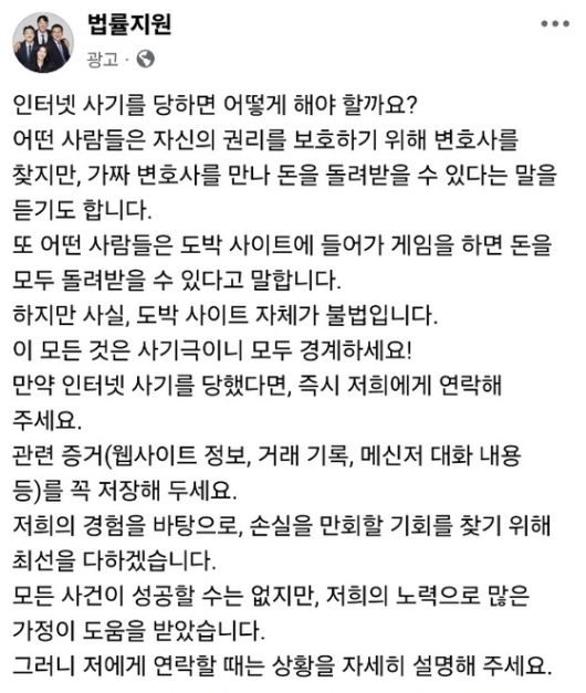 지난달 28일 경북 김천에 위치한 대한법률구조공단 본부에 “김민경 변호사가 있느냐”고 묻는 민원인 A씨가 방문했다. A씨는 앞서 사기를 당해 1억원의 피해를 본 상태에서 “법적 대응을 도와주겠다”는 페이스북 광고를 봤다고 했다. 광고에 등장하는 대한법률구조공단 소속 김민경 변호사라고 주장하는 사람에게 소송 비용 2600만원을 이체했지만 이후 연락이 끊겨 김천 본부까지 온 것이었다.