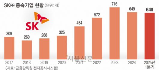 SK㈜의 종속회사 수는 한동안 급증세를 보이다 지난해부터 감소세로 돌아섰다. 2018년 260개였던 종속회사는 2019년 288개, 2020년 325개, 2021년 454개, 2022년 572개로 해마다 늘었고 2023년 말에는 716개나 됐다. 하지만 지난해 말 649개로 감소하면서 본격적인 리밸런싱 효과가 나타나기 시작했다. 이는 2017년 309개에서 2018년 260개로 줄어든 이후 6년 만의 감소였다.