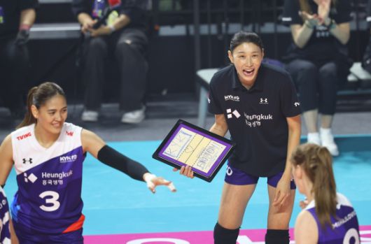 2024~25시즌을 끝으로 은퇴한 ‘배구 여제’ 김연경(가운데)이 18일 인천 삼산월드체육관에서 열린 여자배구 세계올스타전 ‘KYK 인비테이셔널 2025’를 통해 다시 코트를 찾았다. 김연경은 자신의 은퇴를 기념해 열린 이번 친선대회에서 1세트와 3세트는 감독으로, 2세트와 4세트는 유니폼을 입고 선수로 뛰었다. 사진은 감독으로 나서 ‘ENJOY’(즐겨라)라고 적힌 전술판을 들고 선수들을 격려하고 있는 김연경.